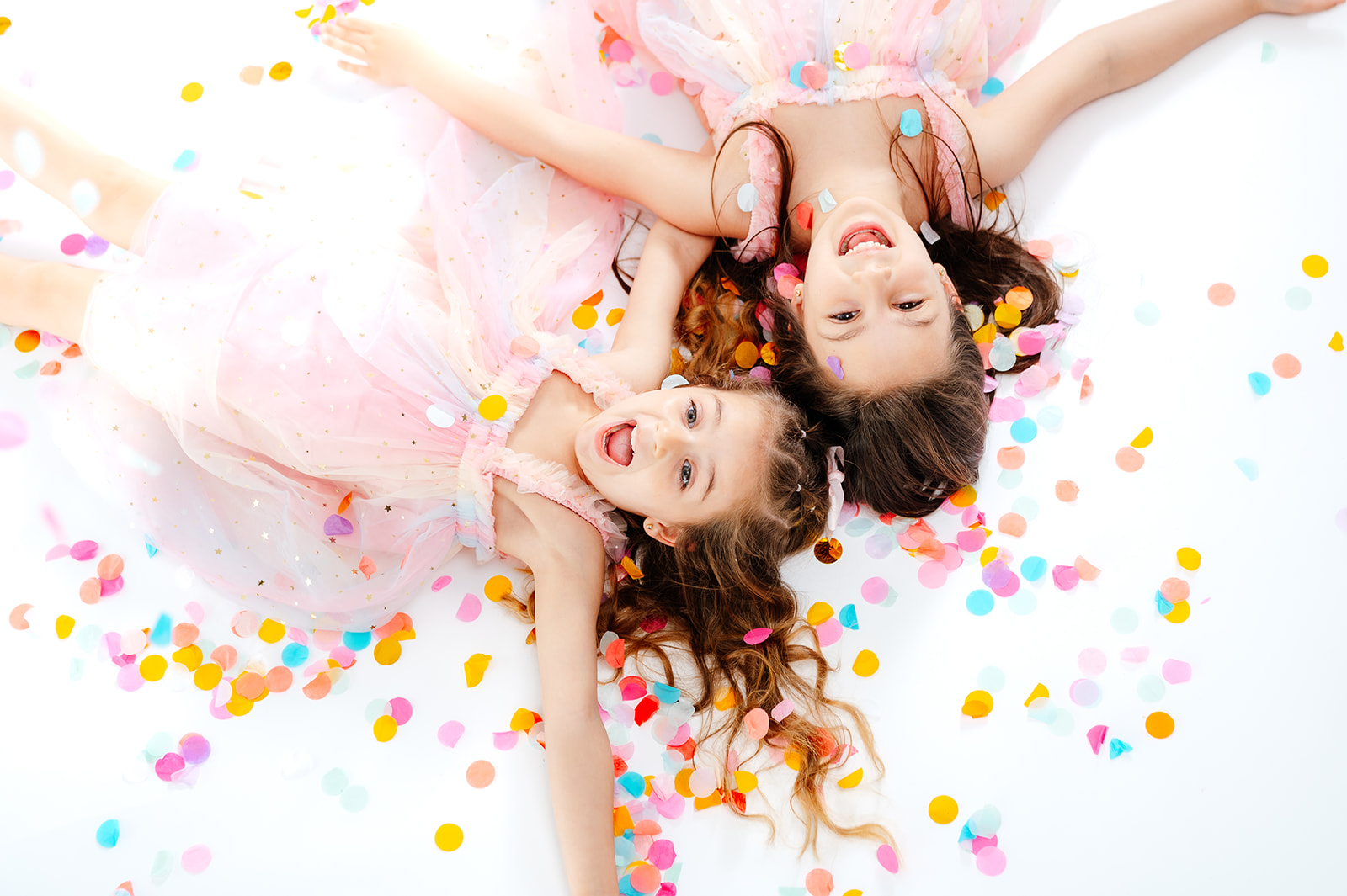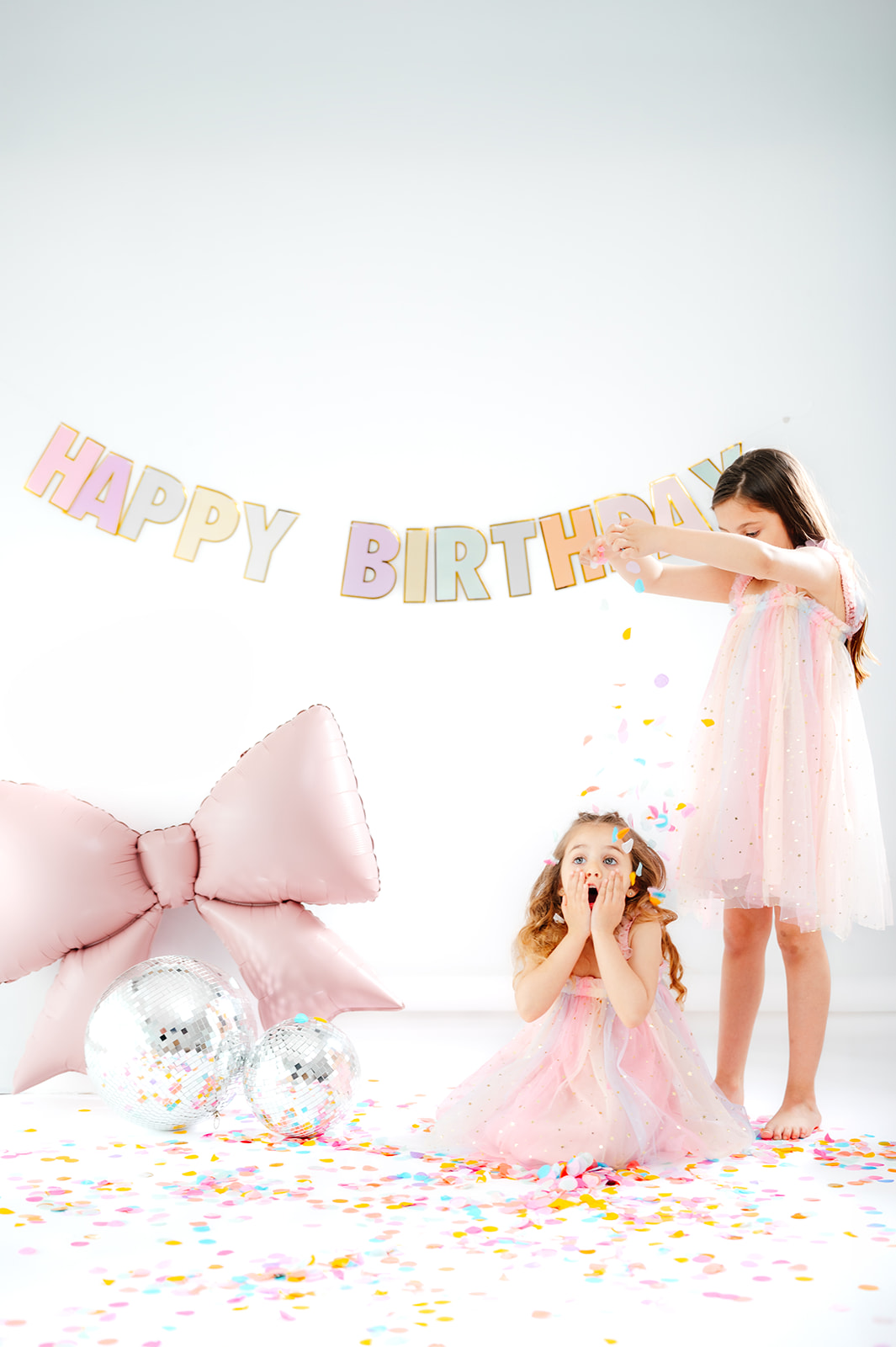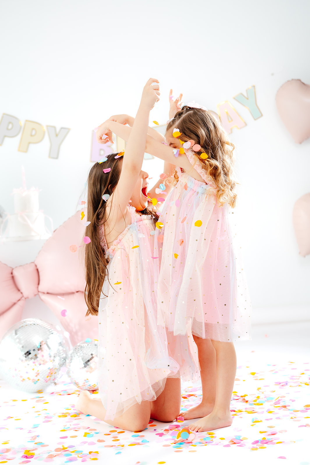 Daniela llegó con muchísima ilusión y, en cuanto empezamos a lanzar confeti, todo se convirtió en un pequeño festival de risas. Su hermana Sofía no tardó en unirse al juego y juntas llenaron el estudio de momentos espontáneos que son justo los que hacen que estas sesiones sean tan especiales.